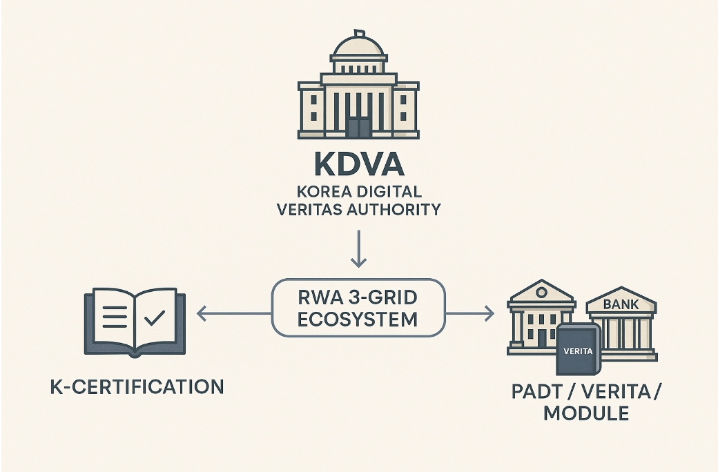 대한민국이 만든 세계 최초의 디지털 신뢰 패러다임— KDVA · K-인증 · RWA 3-Grid Ecosystem · PADT · RWA-MODULE의 기념비적 의의 —21세기 디지털 경제의 핵심 가치는 더 이상 데이터나 자산이 아니다.**진실(Veritas), 신뢰(Trust), 정합성(Integrity)**이다.그리고 대한민국은 이제,이 신뢰를 국가가 직접 제공하는 세계 최초의 국가 디지털 신뢰 총괄체계를 완성했다.그 이름이 바로 KDVA(Korea Digital Veritas Authority) 이다.KDVA를 중심으로 한 K-인증(K-Certification), RWA 3-Grid Ecosystem, PADT, RWA-MODULE체계는 전 세계 어디에도 존재하지 않는 완전히 새로운 국가 아키텍처..